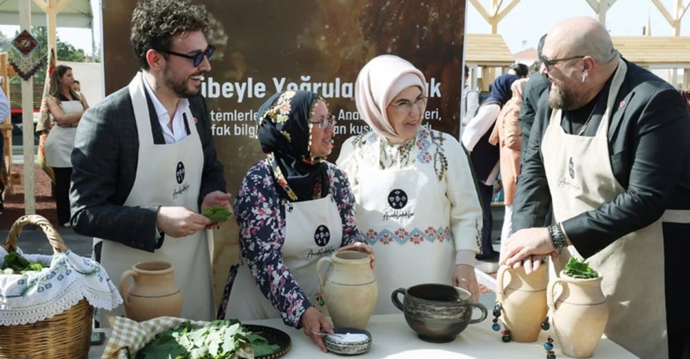 Deneyimleme alanlarını da ziyaret eden Emine Erdoğan, Nevşehirli girişimci kadınlar ve mutfak şefleriyle asma yaprağı basmayı deneyimledi.