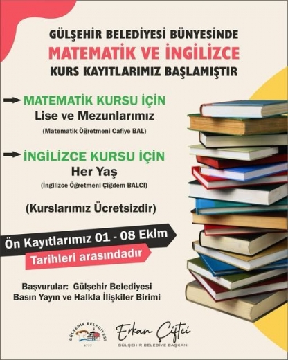 Gülşehir Belediyesi tarafından düzenlenen ücretsiz matematik ve İngilizce kurslarının ön kayıt süreci 1-8 Ekim tarihleri arasında yapılacak.