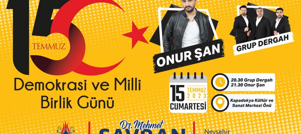 Nevşehir Belediyesi tarafından 15 Temmuz Demokrasi ve Milli Birlik Günü dolayısıyla düzenlenecek olan Demokrasi Zaferi Konseri’nde Onur Şan ve Grup Dergah sahne alacak.